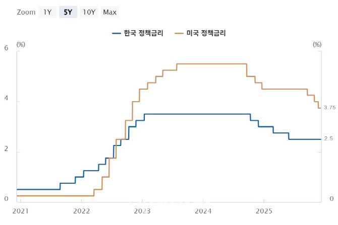 한미 금리 금리차가 125bp로 줄어든 것은 지난 2023년 2월 이후 2년 10개월 만이다. 한미 금리차는 2022년 9월 이후 미국이 우리보다 금리가 높은 역전 상태가 지속되고 있다. 코로나19 대유행 시기 경기 부양을 위해 과도한 유동성이 풀리면서 물가가 치솟자, 각국 중앙은행이 긴축 정책을 펼치는 국면에서 연준이 빠르게 금리를 인상하면서다.