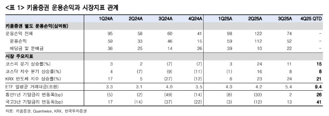 브로커리지 부문 실적도 좋을 것으로 봤다. 10~11월 국내 주식 시장 일평균 거래대금(ETP 등 제외)은 39조 1000억원이다. 11월 중하순 이래 시장이 부진했음에도 시장 일평균 거래대금은 32조원 내외에서 하방경직성이 확보된 상황이다. 최근 추세가 12월까지 유지될 시엔 올해 4분기 일평균 거래대금은 30조원대 후반에서 형성돼 현재 당사 4분기 일평균 거래대금 추정치 32조원을 웃돌 것으로 봤다.
