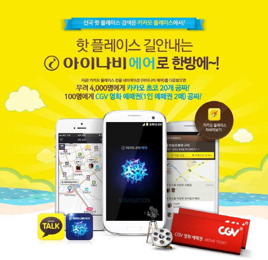 6일부터 19일까지 ‘아이나비 AIR for Kakao’를 다운 받은 고객 중 추첨을 통해 카카오초코, 영화예매권 등을 증정한다. 또 10월 20일까지 ‘아이나비 AIR for Kakao’의 그룹주행 기능을 이용해 보고 사용후기를 남기면 매월 추첨을 통해 전용 거치대를 증정하고 있다.