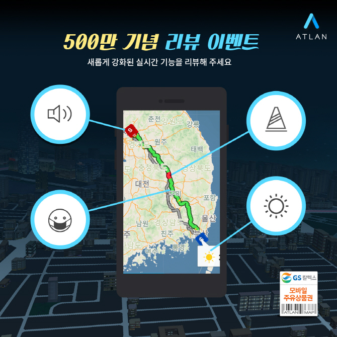 맵퍼스는 ‘3D지도 아틀란’ 다운로드 수 500만 돌파를 기념해 구글 스토어 리뷰 이벤트를 진행한다. 오는 20일까지 아틀란 앱을 다운로드하고 리뷰를 작성한 후 응모하면 추첨을 통해 총 30명에게 2만원 상당의 주유상품권을 제공한다. 기존 사용자들은 리뷰만 작성해도 응모 가능하다.