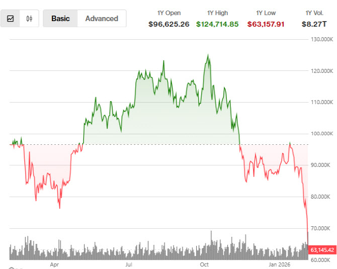 5일(현지시간) 비트코인은 장중 한때 6만2300달러대까지 밀리며 지난해 11월 이후 최저 수준을 기록했다. 지난해 10월 초 12만6000달러 안팎에서 형성된 고점 대비 하락률은 45~50%에 달하며, 이번 주에만 20% 가까이 급락했다. 시장 데이터 기준으로는 2022년 중반 이후 가장 큰 하루 낙폭이다.