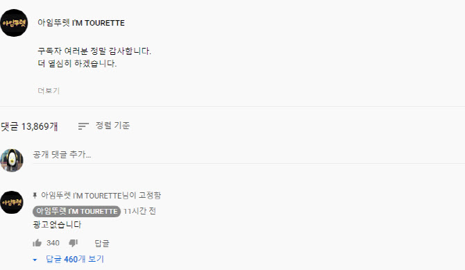 모든 영상을 삭제하겠다던 아임뚜렛의 유튜브에는 사과 영상을 제외한 19개의 영상이 그대로 있다. 지난 4일 올린 영상 밑에는 “광고 없습니다”라는 그의 댓글이 적혀 있었다. 댓글은 논란 이후인 7일에 작성된 것이다.