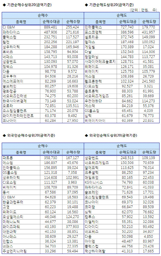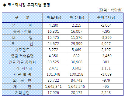[표]코스닥 기관/외국인 매매동향(1/25 최종)