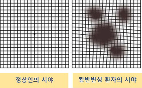 초기 황반변성을 집에서 셀프 체크할 수 있는 방법이 있다. 암슬러 격자라고 바둑판 모양의 직선을 보면서 직선인지 아닌지, 암점이 있는지 없는지 등을 체크하는 방법이다. 이때 중요한 것은 꼭 한쪽 눈씩 해야 한다는 것이다. 출혈이 생긴 경우에는 검은 점이 생겨 시야의 일부가 보이지 않게 되어 특정 글자가 사라지거나 끊어져 보이고 직선이 구불구불해 보인다.
