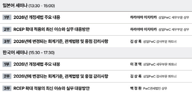 한국어 세미나에선 일본계 기업 세무 서비스 분야에서 경험을 쌓아온 이경택 파트너가 주요 세법 개정사항을 다룬다. 이어 김상록 파트너가 회계감사 동향을 소개하고, 백정환 PwC관세법인 상무가 RCEP(역내포괄적경제동반자협정)과 관련한 최신 관세 이슈를 설명할 예정이다.