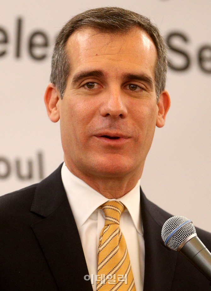 [이데일리 김정욱 기자] 24일 서울 소공동 롯데호텔에서 열린 '주한미국상공회의소(암참)-LA상공회의소 양해각서 체결식'에서 에릭 가세티 로스앤젤레스 시장이 인사말을 하고 있다.