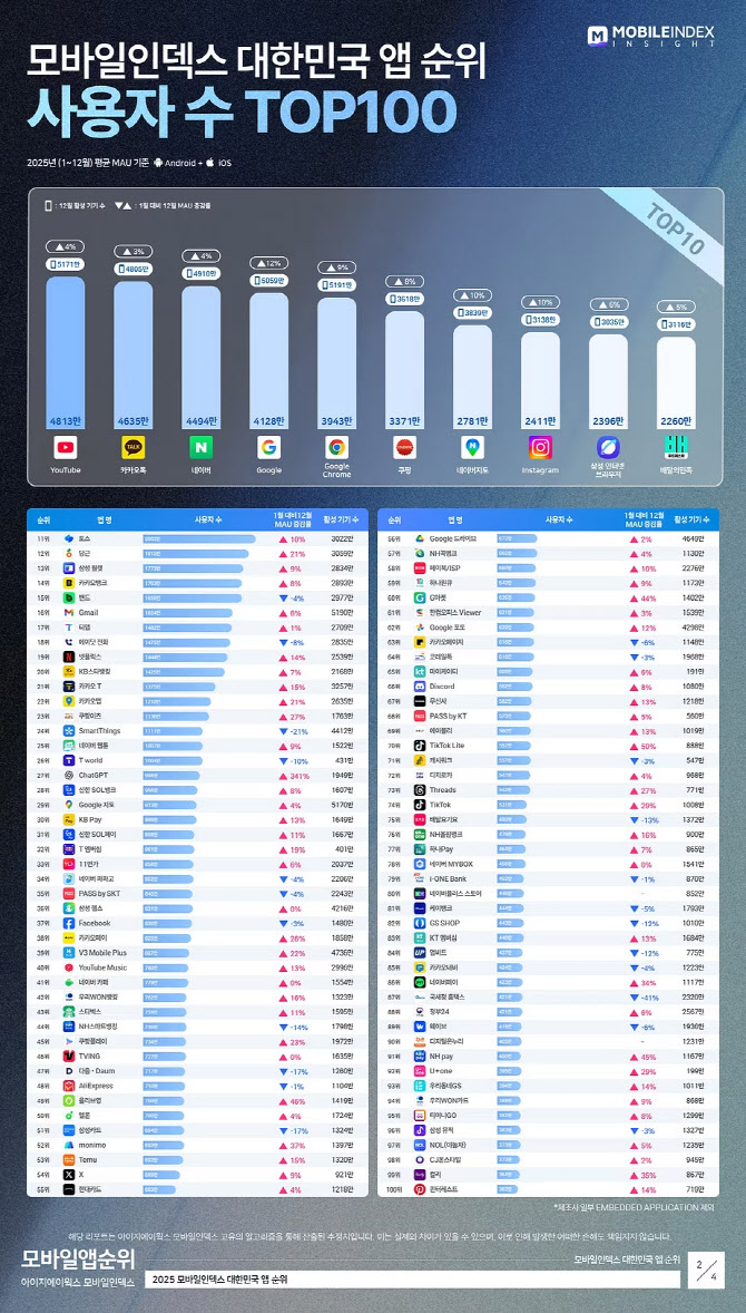 유튜브·카카오톡·네이버·구글 등 ‘국민 앱’ 중심의 상위권 구도는 여전히 견고했지만, 생성형 AI 앱인 챗GPT(ChatGPT)는 1월 대비 12월 사용자 수가 341% 증가해 사용자 수 TOP100에서 27위에 오르는 등 가파른 성장세를 나타냈다. 이번 분석은 2025년 1월부터 12월까지 안드로이드 및 iOS 통합 데이터를 기반으로 평균 MAU를 산출했다.