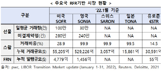 실제로 미국과 영국의 RFR 선물시장의 경우 전년 동월 대비 올해 1월 선물 거래량은 약 10배, 6배씩 늘었으며 미결제약정은 각각 3배, 12배 늘었다. 미결제약정이란 반대매매를 하지 않은 보유 선물계약으로 미결제약정 증가는 신규 포지션의 증가를 의미한다.