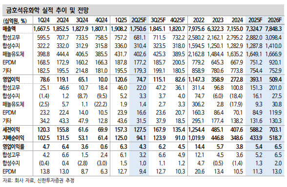EPDM(고부가 고무)은 스프레드 상승(+7%)에도 정기보수 관련 일회성 및 신규 설비 가동 비용으로 166억원(-30%) 예상했고, 기타·에너지는 SMP 상승에도 정기보수 영향으로 감익(-28%)을 전망했다.