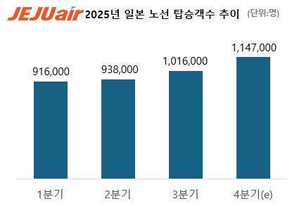 일본 노선의 분기별 탑승객수도 1분기 91만6000여명에서 2분기 93만8000여명, 3분기 101만6000여명으로 지속적으로 증가하고 있다. 4분기에는 114만7000여명에 달할 것으로 예상된다.