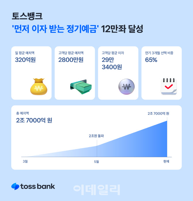 ‘먼저 이자 받는 정기예금’은 토스뱅크가 처음으로 선보인 정기예금 상품이다. 인터넷전문은행 최초로 가입과 동시에 이자를 먼저 제공한다. 금리는 연 3.5%(세전, 만기일에 세금 차감)로, 가입한도는 최소 100만원에서 최대 10억원까지다. 가입 기간도 3개월 또는 6개월로 짧게 유지해 고객 편의에 따라 운용할 수 있다는 장점이 있다.