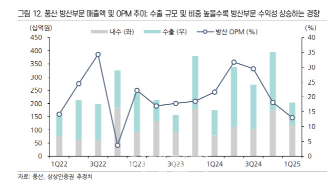 실적 전망과 관련해 그는 "지난 1분기 실적발표 당시 풍산 측은 2분기 신동부문에 대한 매출액 가이던스를 6729억원으로 제시했고, 방산부문 매출액은 총 3290억원(내수 1298억원, 수출 1992억원), 세전이익은 1000억원 수준으로 제시했다"고 전했다.