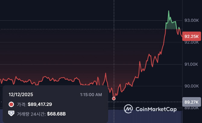 11일 다우존스30산업평균지수와 스탠더드앤드푸어스(S&P)500 지수는 사상최고치를 경신했다. 전날 연방준비제도(Fed·연준)의 기준금리 인하 결정으로 뉴욕 증시가 살아나는 양상이다. 반면 비트코인은 11~12일 장중에 9만달러가 붕괴됐다. 이후 시세가 올라 12일 오전 7시50분 현재 9만2000달러대를 기록 중이다 .