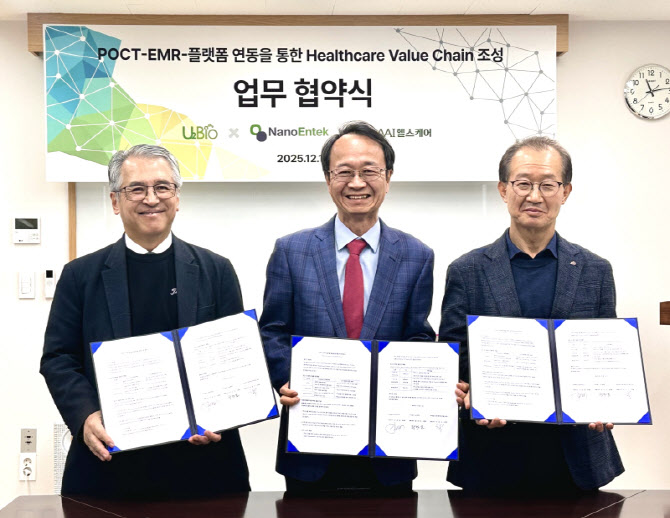 이외에도 3사는 △나노엔텍의 POCT 국내 공급 확대 △유투바이오의 분자진단 상품 결합을 통한 B2B마케팅 등을 협업할 예정이다. 내년 7월 커넥티드 헬스케어 서비스 사업 추진을 목표로 12월 공동 TF(태스크포스) 구성, 내년 1월부터 PoC(개념검증) 추진 및 본사업 준비에 돌입할 계획이다.