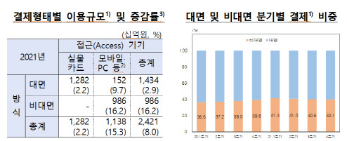 결제형태별로는 스마트폰 등 모바일 기기를 통한 비대면결제는 하루 평균 9860억원(잠정치)으로 전년 대비 16.2% 증가한 것으로 나타났다. 비대면결제 뿐만 아니라 지난해까지 감소세를 이어오던 대면 결제도 작년 한해 증가세로 전환해 하루 평균 이용규모가 2.9% 증가한 1조4340억원을 기록했다. 비대면결제 증가율이 더 큰 폭 늘면서 2020년 4분기 전체 결제 중 39.6%를 차지했던 비대면결제 비중은 1년 뒤인 작년 4분기 40.1%로 증가했다. 비대면 결제엔 PC 등을 이용한 온하인 결제 등 뿐만 아니라 모바일 기기를 통해 현장에서 단말기 접촉 없이 이루어지는 방식도 포함된다.