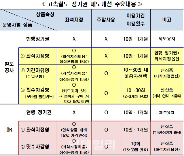 현행 KTX 입석·자유석용 고속철도 정기권에 좌석 지정옵션을 부여해 정상운임의 15%만 추가 부담하면 좌석을 지정할 수 있게 했다.