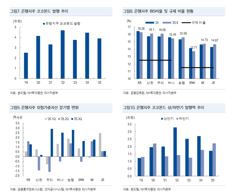 NH투자증권은 “올해 코코본드 발행의 주요 특징은 2020년 이후 다시 상반기보다 하반기 발행이 많았다는 점”이라며 “이는 2020년 발행했던 코코본드의 첫 번째 만기가 올해 도래하면서 하반기에 차환 목적의 발행이 있었고, 3분기 가계대출 증가 등으로 지주사들의 위험가중자산 증가 폭이 크게 확대됐기 때문으로 판단된다”고 설명했다.