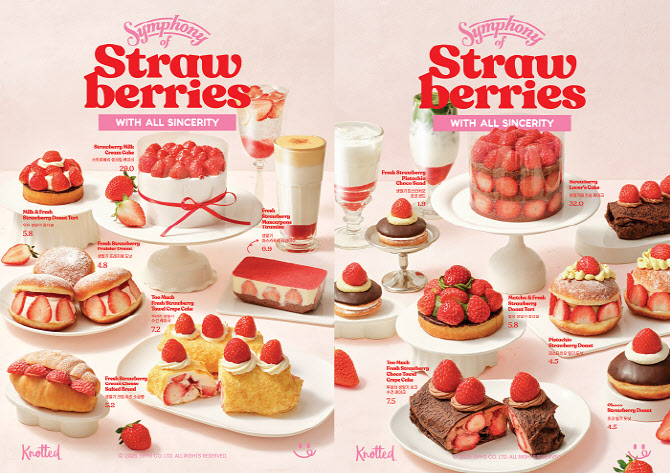 도넛과 베이커리 제품으로 △생딸기 프레지에 도넛 △피스타치오 딸기 도넛 △초코 딸기 도넛 △우유 생딸기 꽃다발 △말차 생딸기 꽃다발 △생딸기 크림치즈 소금빵 △생딸기 피스타치오 초코 샌드 △생딸기 마스카포네 티라미수 △스트로베리 생크림 케이크 등을 선보인다.