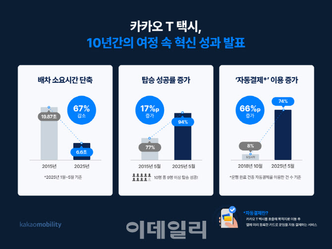 카카오 T 앱 내 축적된 데이터 분석 결과 카카오 T 택시 호출 후 평균적으로 택시 배차에 소요되는 시간은 출시 초인 10년 전과 비교해 약 67% 단축됐고, 탑승 성공률은 94%까지 높아진 것으로 집계됐다.