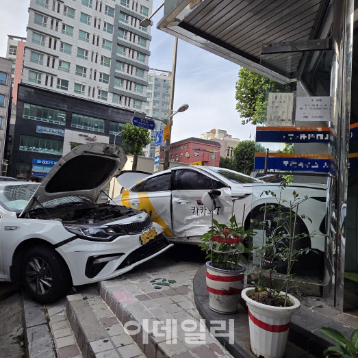 | | 23일 오전 서울 영등포구의 한 건물 앞에서 택시 추돌사고가 발생하면서 차량과 건물 일부가 파손됐다.(사진= 김현재 수습기자) |