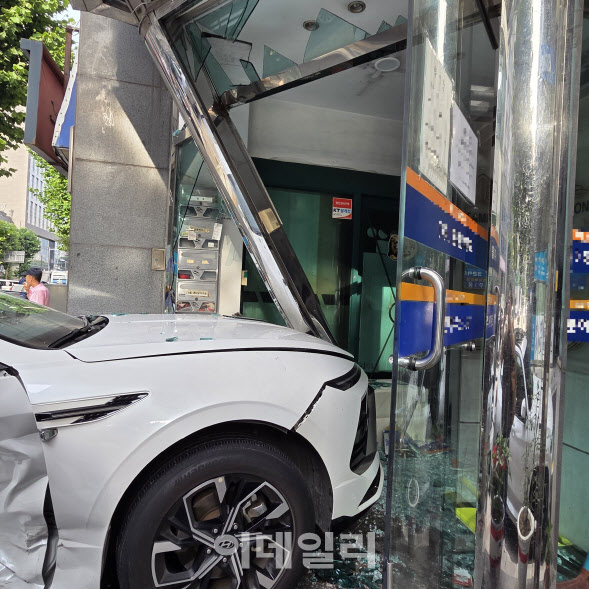 | | 23일 오전 택시가 서울 영등포구의 한 건물과 충돌해 출입구 일부가 파손됐다.(사진=김현재 수습기자) |