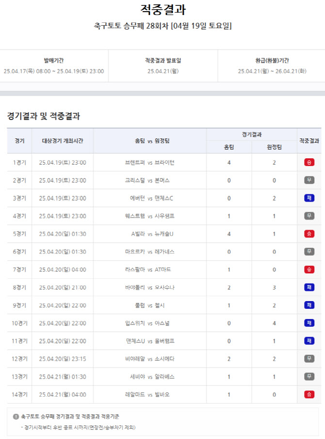 이번 축구토토 승무패 28회차에서는 총 14경기 중 무승부(무)가 무려 5경기에 달하며, 참가자들의 예측을 어렵게 만드는 변수로 작용했다는 평이다. 홈팀 승리(승)는 4경기, 원정팀 승리는 5경기로 집계됐다.
