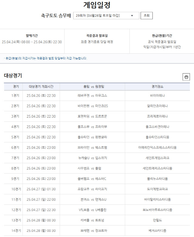 29회차 대상경기에는 리버풀-토트넘, 레버쿠젠-아우크스부르크, 바이에른 뮌헨-마인츠 등 빅매치들이 포함돼 주목된다.