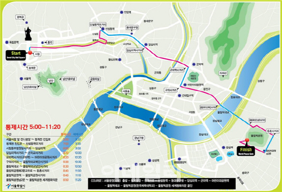 서울광장은 오전 5시~오전 9시 30분, 청계천 진입로~신설동역오거리 오전 7시 50분부터 오전 9시 30분, 시립동부병원앞사거리~답십리역 오전 8시부터 오전 9시 50분, 답십리역사거리~군자교사거리는 오전 8시 10분부터 오전 10시까지 통제된다.