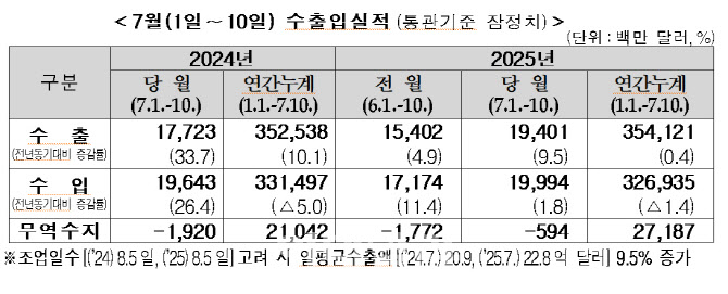 일평균으로 환산할 경우 수출 증가 폭은 확대된다. 조업일수는 작년 같은 기간과 비교해 8.5일로 동일했고, 일평균수출액은 22억 8000만달러로 전년(20억 9000만달러)대비 9.5% 증가했다.