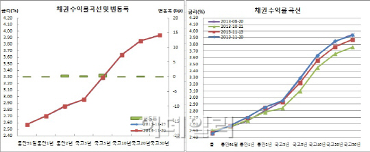 반면 통안2년물이 1.2bp 오른 2.855%를 기록했다. 국고3년 13-3도 0.5bp 상승한 2.955%를 나타냈다. 국고5년 13-5 역시 1.7bp 올라 3.300%로 거래를 마쳤다. 국고10년물은 1bp 오른 3.640%를 기록했다. 국고20년 11-7과 국고30년 12-5 역시 0.5bp씩 올라 3.855%와 3.950%로 거래를 마쳤다. 국고10년 물가채 13-4는 1.4bp 상승해 1.740%를 보였다.