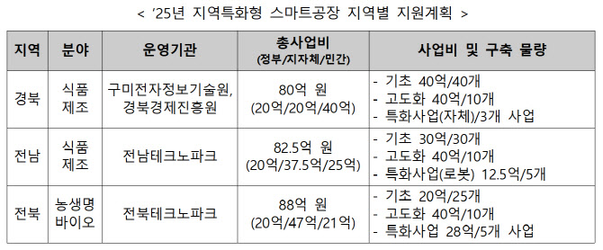 경북에서는 40억원의 예산으로 식품제조 분야의 스마트공장 구축(50개)을 지원한다. 지원기업 대상으로 협력 네트워크 구축, 기술컨설팅, 인증평가 등의 사업화 지원과 정책자금, 마케팅, 수출역량강화 등의 지역특화 프로그램도 연계해 지원한다.