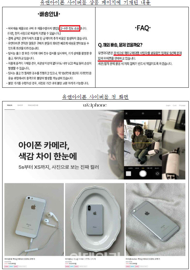 공정거래위원회는 8일 중고 아이폰 사이버몰 운영사 제이비인터내셔널(유앤아이폰)과 올댓(리올드)의 ‘전자상거래 등에서의 소비자보호에 관한 법률’(전자상거래법) 위반행위에 대해 임시중지명령을 내렸다. 두 사이버몰의 대표는 동일하며, 임시중지명령은 사이버몰을 임시 차단하는 조치다.