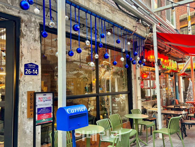 최근 MZ세대 핫플레이스로 떠오른 서울 용산구 해방촌 신흥시장 곳곳에 3일 파란색 크리스마스 장식으로 꾸며진 가게들이 등장했다. 캐리어에어컨을 생산하는 냉난방 및 공조기기 업체 오텍캐리어가 젊은 세대와 접점을 늘리기 위한 마련한 공간이다. 파란색은 캐리어에어컨 브랜드의 상징색이다. 오텍캐리어는 2023년 용리단길, 2024년 을지로에 이어 올해는 신흥시장에서 라이프스타일 캠페인을 진행한다.