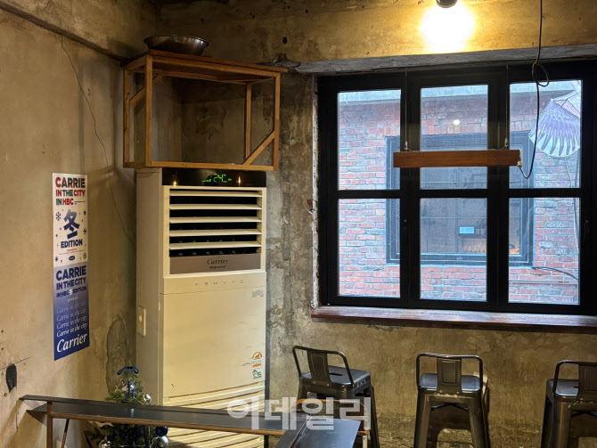 | | 서울 용산구 해방촌 신흥시장 내 카페 오랑오랑에 설치된 캐리어에어컨.(사진=조민정 기자) |