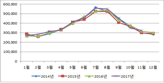 건강보험심사평가원 자료를 토대로 2014년부터 2017년까지 (4개년) 무좀으로 병원을 찾는 사람을 분석한 결과 매년 7~8월에 진료인원이 가장 많았다.