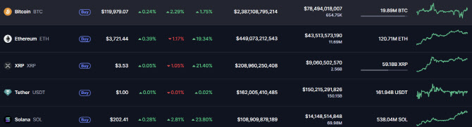 23일 글로벌 가상자산 시황중계 사이트 코인마켓캡에 따르면 이날 오전 8시 7분 기준 비트코인 가격은 24시간 전 대비 2.29% 오른 11만 9979달러를 기록했다. 일주일 전과 비교하면 1.75% 올랐다. 오전 8시 22분 기준으로는 전일 대비 2.55% 오른 12만 166달러를 기록하며 12만 달러를 넘어섰다. 알트코인(비트코인 외 가상자산)의 대표격인 이더리움은 전일 대비 1.17% 하락한 3721달러에 거래됐다.