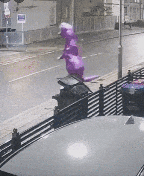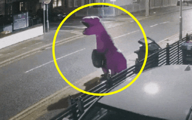 이웃집 CCTV에 녹화된 영상은 공룡 복장을 한 누군가가 도로를 뒤뚱거리며 건너는 모습으로 시작한다. 자세히 보니 공룡 ‘티렉스’를 본떠 만든 전신 의상이다.