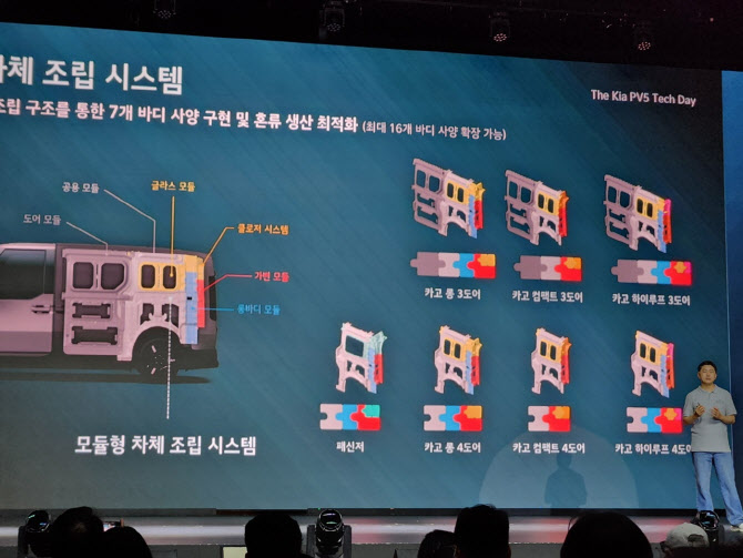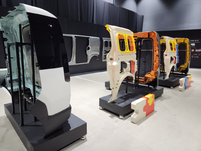 PV5의 핵심은 세계 최초로 상용 전기차에 적용된 ‘플렉시블 바디 시스템’이다. 전면부와 후면부를 고정한 채 1열 이후 차체를 모듈 단위로 조립할 수 있도록 설계돼 다품종 소량생산에 유연하게 대응할 수 있다.