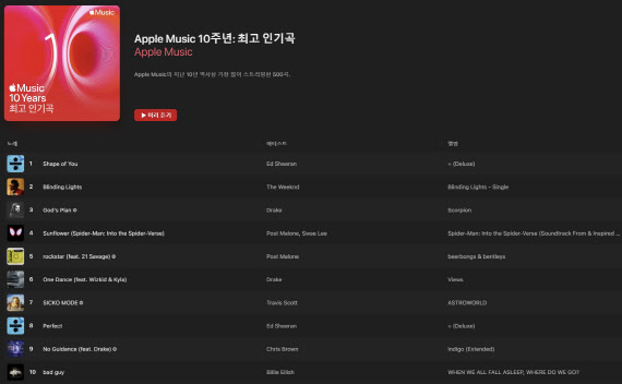 이번 순위는 지난 1일(현지 시각) 미국을 시작으로 ‘10 Years of Apple Music: Top Songs’ 플레이 리스트와 라디오 프로그램을 통해 하루 100곡씩 순차 공개했다.