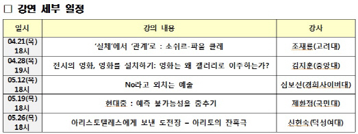이달 △21일 조재룡(고려대)의 ‘실체에서 관계:소쉬르-파울 클레’를 시작으로 △28일 김지훈(중앙대)의 ‘전시의 영화, 영화를 설치하기:영화는 왜 갤러리로 이주하는가?’ △5월 12일 심보선(경희사이버대)의 ‘No라고 외치는 예술’ △5월 19일 제환정(국민대)의 ‘현대춤: 예측 불가능성을 춤추기’ △5월 26일 신현숙(덕성여대)의 ‘아리스트텔레스에게 보낸 도전장-아리토의 잔혹극’ 등 총 5개의 강좌가 열린다.