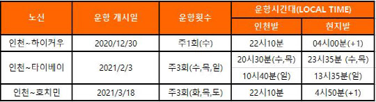 제주항공의 인천~호치민 화물 노선은 인천국제공항에서 매주 화, 목, 토요일 오후 10시10분에 출발해 호치민에는 이튿날 새벽 1시50분에 도착한다.