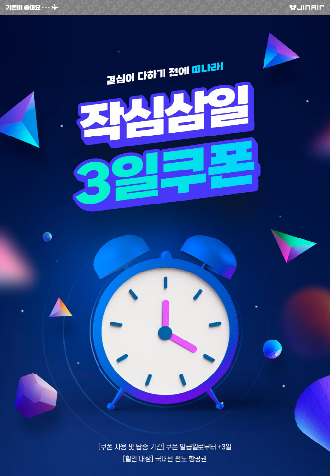 진에어는 출발 임박 국내선 항공편을 대상으로 예매 할인 혜택을 제공하는 작심삼일 3일 쿠폰 이벤트를 31일까지 진행한다.