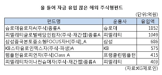 26일 펀드평가사 KG제로인에 따르면 ‘슈로더유로자A(주식)종류A’에 올 들어 지난 22일까지 1852억원에 달하는 자금이 들어와 해외 주식형펀드 중 가장 많은 돈을 흡수한 것으로 나타났다. 1월에 654억원이 순유입된 것을 비롯해 지난 6월을 제외하고 매달 자금이 들어왔다.