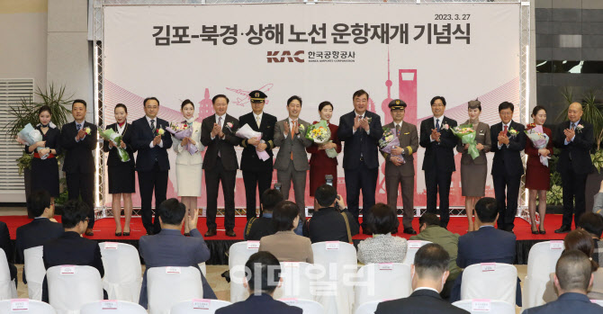 [이데일리 방인권 기자] 윤형중 한국공항공사 사장과 싱하이밍 주한중국대사, 우기홍 대한항공 사장, 원유석 아시아나항공 부사장, 지아항위 중국국제항공 한국대표 등 한중 항공사 CEO와 김포공항 CIQ(세관,출입국,검역) 상주기관장을 비롯한 참석자들이 27일 김포공항 국제선 터미널에서 열린 한·중 노선(김포~베이징, 김포~상하이) 운항 재개를 축하하는 기념행사에서 기장 및 승무원에게 꽃다발을 증정한 뒤, 기념촬영을 하고 있다.