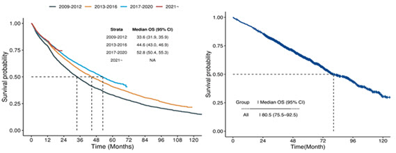 혈액병원(혈액병원장 김희제 교수) 다발골수종센터 민창기·박성수·이정연·변성규 교수팀이 12년간 치료받은 다발골수종 환자군(1,291명)을 조사한 결과 중앙 생존기간(Median Overall Survival, OS)이 80.5개월(2010년 ~2021년)이었다. 난치성 혈액암 치료 성적을 장기간 분석하여 공개한 국내 첫 사례다.