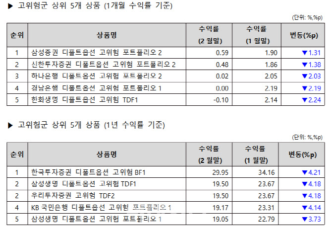 13일 펀드평가사 에프앤가이드에 따르면 지난 2월 말 기준 퇴직연금 디폴트옵션 데이터를 분석한 결과, ‘한국투자증권 디폴트옵션 고위험 BF1’의 1년 수익률이 29.95%로 집계돼 가장 높았다. 다만 전월(1월 말 기준 1년간 수익률)과 비교하면 4.21%포인트 하락했다.