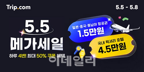 트립닷컴은 ‘5.5 메가 세일’(Mega Sale)을 통해 일자와 시간대별로 국내외 항공권, 숙소 특가 딜, 할인 쿠폰 등 풍성한 혜택을 선보인다. 먼저, 앱에서만 진행되는 항공권 플래시 딜에서는 5일 서울-제주 왕복 항공권 9900원을 시작으로 7일 오전 10시 서울-오사카, 12시 서울-도쿄와 서울-상하이, 저녁 8시 서울-다낭과 서울-방콕 편도 항공권을 각각 1만 5000원에 선착순 판매한다. 예약 가능 기간은 9월 30일까지며, 유류할증료 등 세금이 모두 포함된 가격이다.