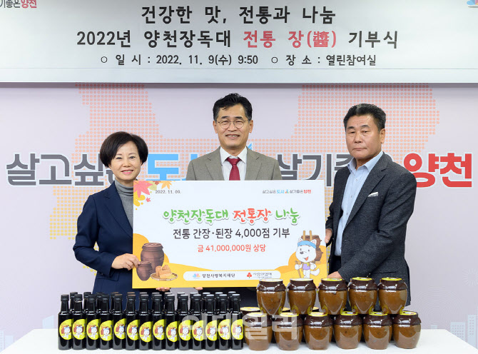 이날 기부된 4천여만 원 상당의 전통장(된장, 간장) 4천 점은 전통식품의 우수성을 알리고 바른 먹거리에 대한 인식개선을 위해 양천구가 4년째 추진 중인 ‘양천장독대’ 사업에서 생산된 제품이다. 전통장은 양천사랑복지재단을 통해 관내 취약계층이 건강하게 겨울을 날 수 있도록 전달될 예정이다.
