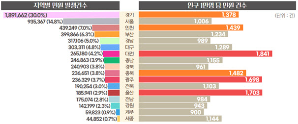 지역별로는 수도권에서 전체 민원의 51.8%가 접수됐으나, 최근 3년간 지속적인 감소세를 보였다. 반면 부산·울산·경남·경북을 포함한 경상권에서는 민원이 꾸준히 증가했다. 인구 1만 명당 민원 건수는 대전이 1841건으로 가장 많았고, 울산(1703건), 광주(1698건) 순이었다. 제주는 900건, 강원은 943건, 경북은 961건으로 나타나 도시 지역의 민원 참여도가 농어촌 지역보다 높은 것으로 분석됐다.