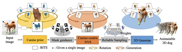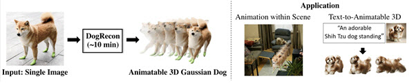 DogRecon은 △개 전용 3D 통계 모델(D-SMAL)을 활용해 품종별 체형과 자세의 세밀한 차이를 반영하고 △생성형 AI(Canine-centric NVS)로 다양한 시점의 이미지를 생성하여 보이지 않는 부위까지 자연스럽게 복원한다. 여기에 △3D 가우시안 스플래팅 기법을 적용해 반려견 특유의 곡선형 실루엣과 털의 질감까지 정밀하게 표현해낸다.